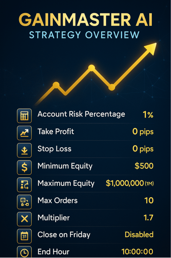 EA GainMaster AI is a conservative MT4 trading system focused on strict capital control, single-direction position scaling, and fixed dollar-based risk/reward targeting. It offers a clean, rules-based approach ideal for long-term account growth and is especially suitable for high-capital or prop firm environments.