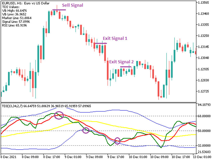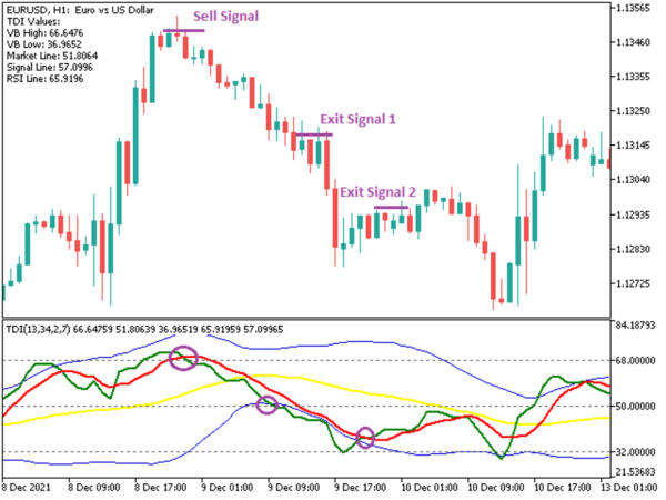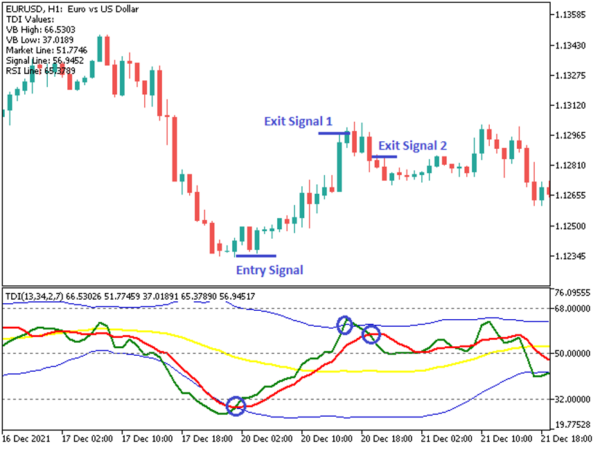 The TDI processes RSI data and smooths it using a moving average. The smoothed RSI (Yellow line) indicates general market direction, while the Green (Fast) and Red (Slow) RSI lines provide short-term momentum cues. The VBHigh and VBLow lines, derived from Bollinger Bands, show market volatility and help define potential reversal or breakout zones.